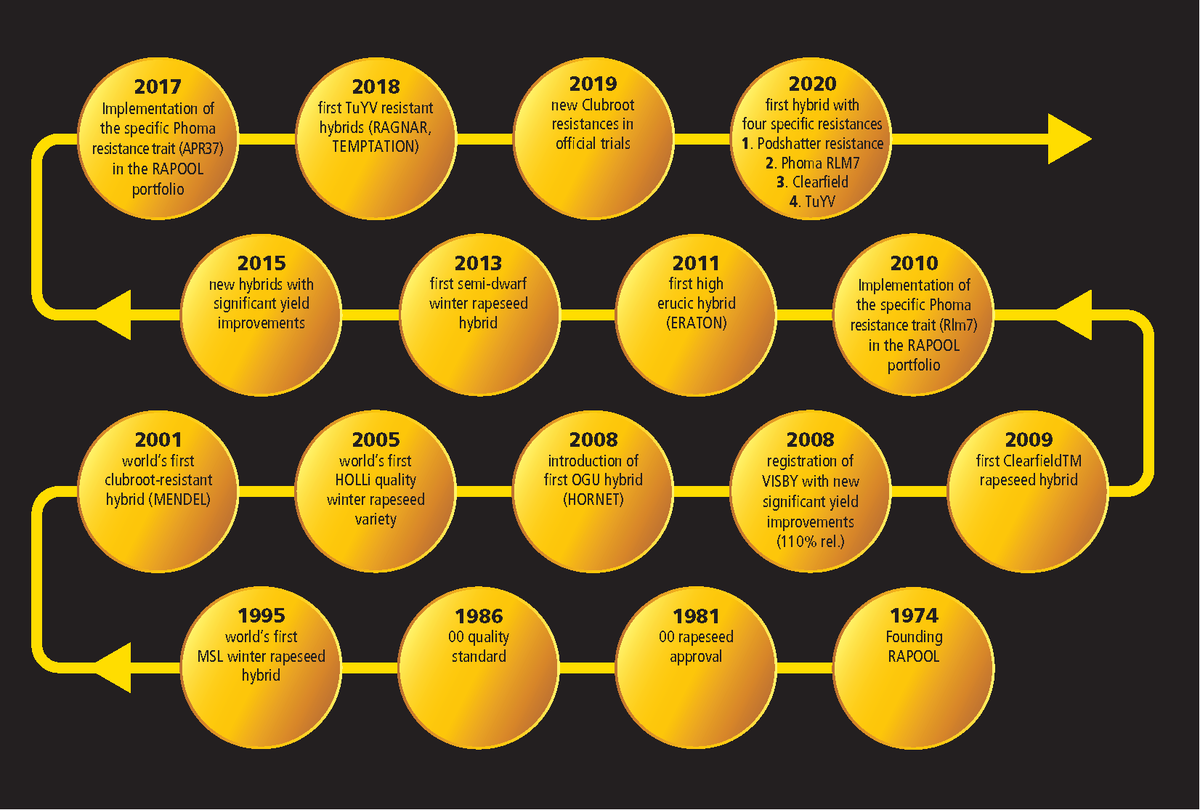 The story of RAPOOL is one of success. Groundbreaking milestones have been set from the very start of the organisation. RAPOOL varieties have had a significant impact on the cultivation and advancement of oilseed rape. With RAPOOL, oilseed rape has become a valuable economic and ecological crop.
