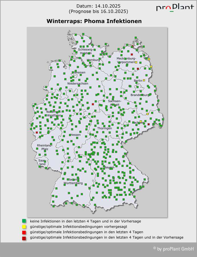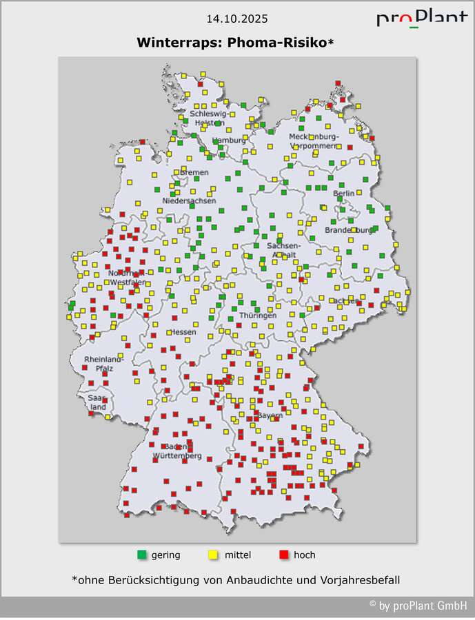 Meistens wird kein kritischer Phoma-Befall beobachtet. In Niedersachsen, Nordhessen und allen Regionen nördlich und östlich davon ist das Risiko für Blattbefall vom Wetter weiterhin gering bis mittel.