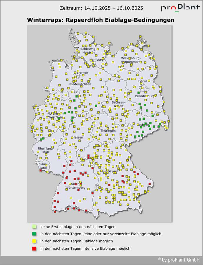 Üppigen Regen gab es seit dem Wochenende nicht und wird deutschlandweit auch bis kommendes Wochenende nicht vorhergesagt. Ist Phoma-Wirkung gewünscht und/oder soll (nochmals) eingekürzt werden: Den Einsatz vorerst schieben, wenn in der zweiten Wochenhälfte bei kühler werdenden Nächten lokal mit Bodenfrost gerechnet werden muss (besonders im Südosten Deutschlands).
