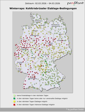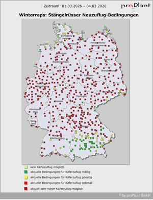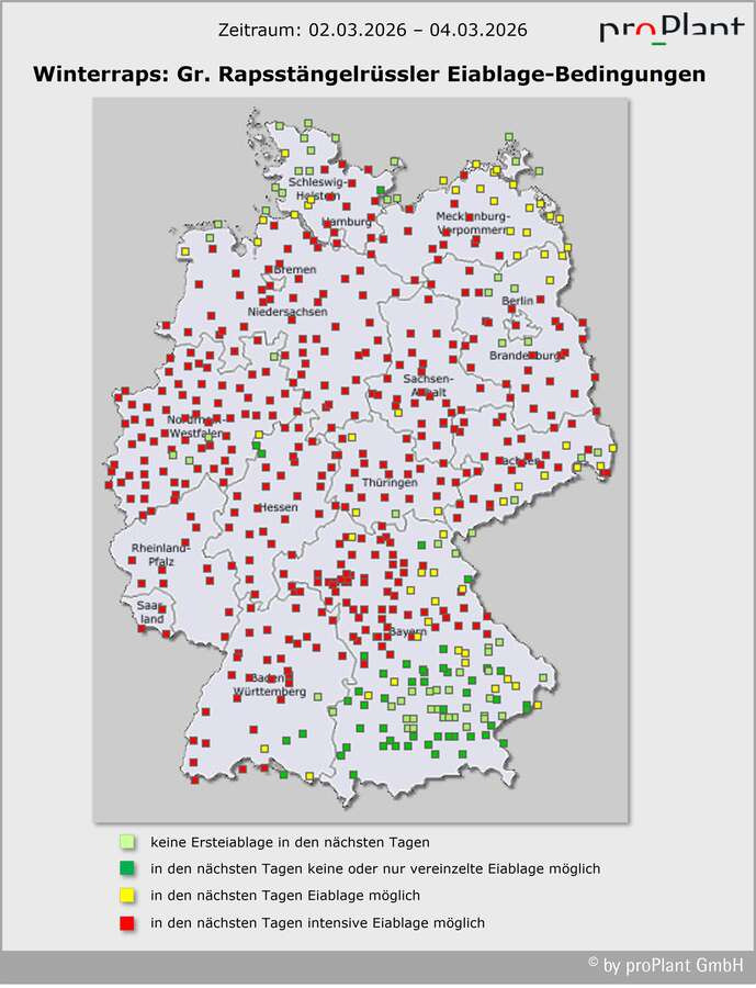 Der optimale Behandlungstermin vor der Eiablage richtet sich nach der Schwellenüberschreitung in den eigenen Gelbschalen. Beim Großen Rapsstängelrüssler und /oder Gefleckten Kohltriebrüssler bereits vergangene Woche und noch nicht durchgeführter Insektizidmaßnahme: Umgehend behandeln, um stärkere Eiablage zu verhindern. Erwarteter Neuzuflug in dieser Woche wird miterfasst.