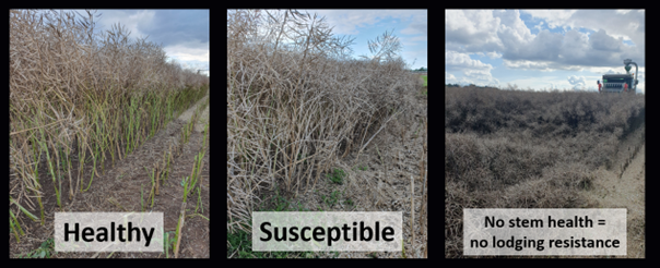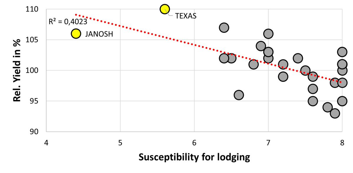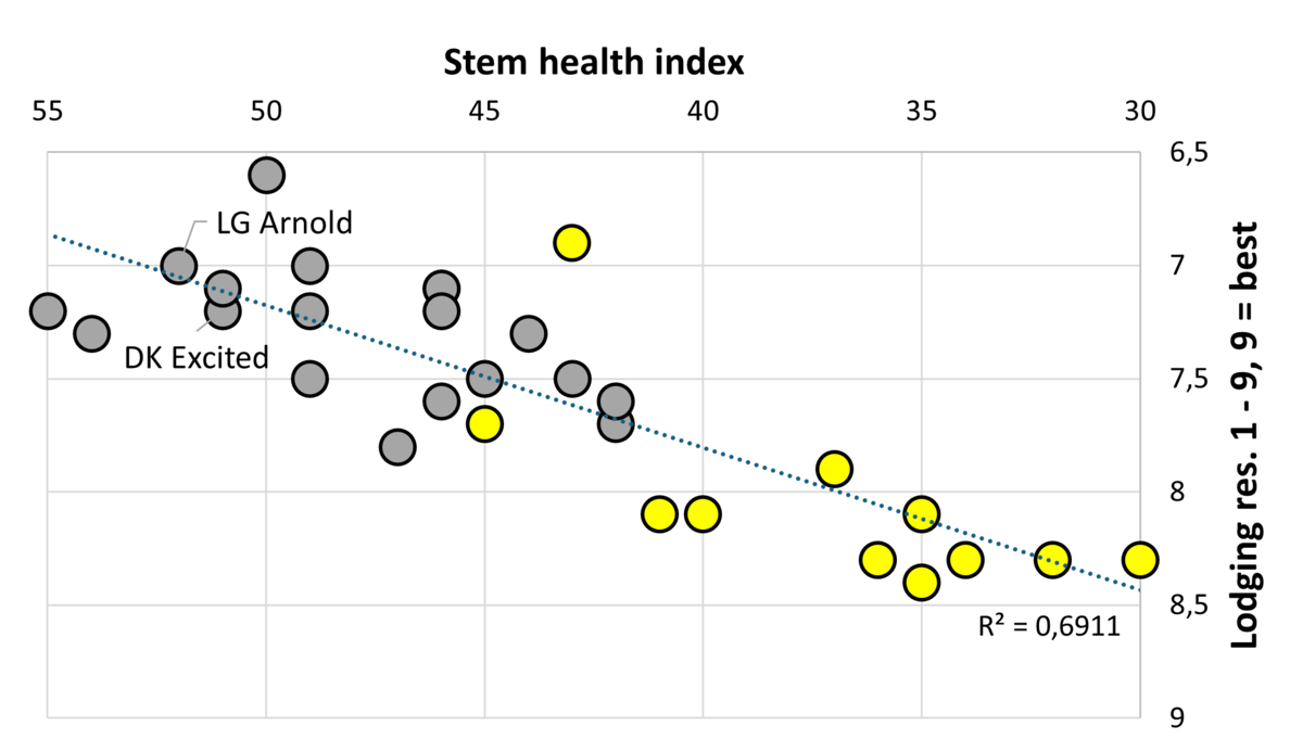 The collected experiences from Czech Republic can be confirmed by further detailed analysis of several disease and agronomy scores, realized by COBORU in Poland. The sum of disease scores against Phoma, Sclerotinia and Verticillium (in %) highlight a wide variance among the tested varieties. Based on the disease scores 2021 – 2023 we get an average stem health index score of 43,6 with a wider range in Verticillium scores (from 15 till 25 %). But especially late Verticillium appearance connected with stronger rainfalls during ripening can led to yield reducing lodging. Therefore, it is no surprise that we see a stronger correlation between strong stem health and lower lodging (Graph 1).