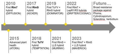 Climate change, tighter crop rotations, and new pests demand more resilient varieties. RAPOOL’s innovative breeding approach provides solutions with resistance against Phoma (Rlm7, RlmS, LepR1/R3) and broad disease tolerance (picture 1).