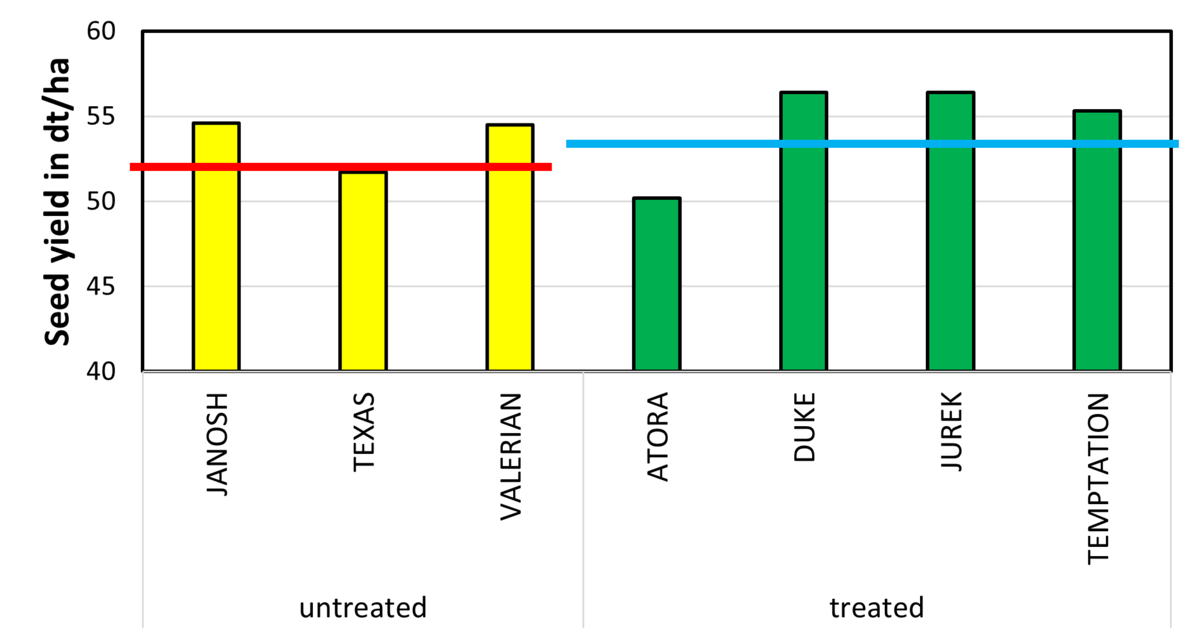 Additionally, the trial network shows also that a full intensive fungicide treatment with n = 3 applications (autumn, spring & flowering) delivers only 160 kg yield plus for JANOSH, TEXAS and VALERIAN. Based on increasing costs for pesticide products and keeping in mind the planned “Green Deal” program by the European Union, farmers can realize with the new RAPOOL RS hybrids satisfying yield respectively a high economical profit, also with a low intensity approach.