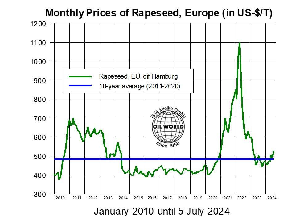 Rapeseed prices are also supported by the prospective production deficit in vegetable oils in 2024/25. In the ANNUAL 2024, OIL WORLD forecasts ample supplies of soybeans while supplies of high oil-yielding oilseeds will likely be insufficient. A relatively small growth in world palm oil production is further raising the dependence on soya oil next season. Global supplies of sunflowerseed and rapeseed are currently forecast to decline by a combined 4 Mn T in 2024/25, following the year-on-year increases in crushings of the two soft seeds by a staggering 18 Mn T in the past two season combined.