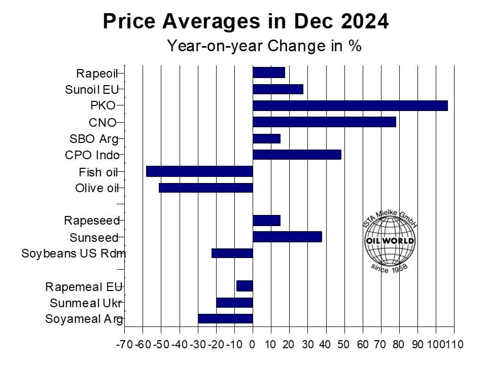 In contrast to soybeans, the prices of rapeseed and even more so of sunseed have risen significantly in 2024 as a result of massive declines in world production. Rapeseed meal and sunflower meal therefore followed the downward trend in soybean meal prices only at a distance.