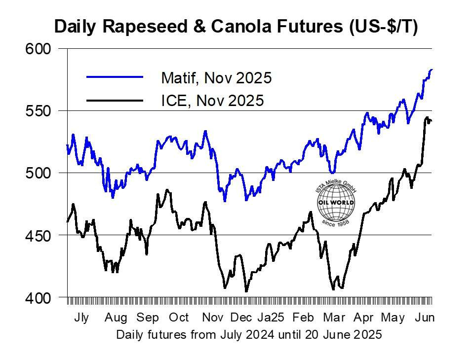 Insufficient supplies are likely to keep rapeseed prices well supported in 2025/26. Partly severe dryness in Canada and Australia as well as bullish vegetable oil demand prospects in North America sparked a rally in rapeseed & canola prices in the week to June 19. New-crop canola prices on the ICE reached a new contract high of CAN-$ 744, up 9% since June 5.